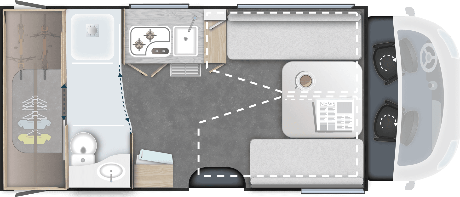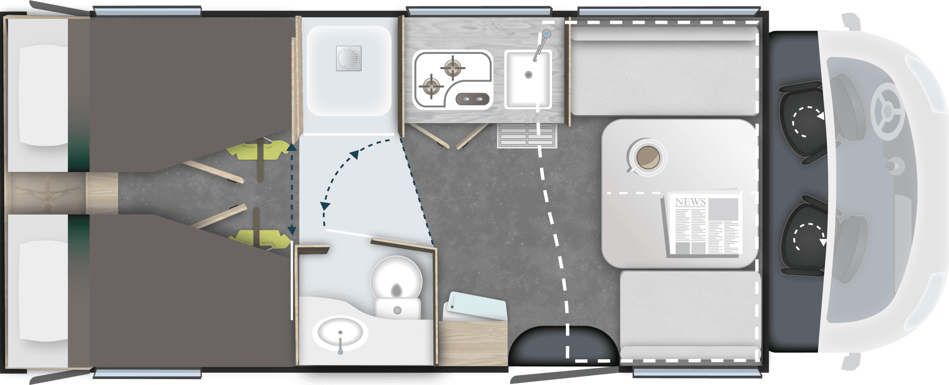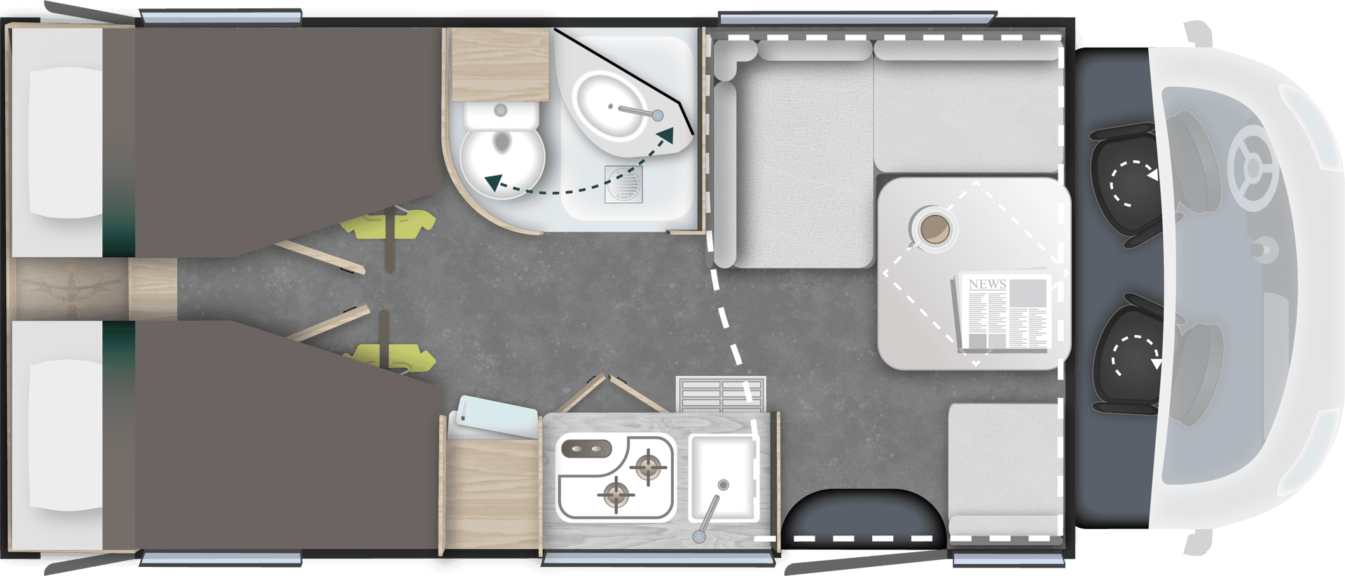 TilbehørspakkeUtvendig markise, 140W solcellepanel, myggnettdør, gardiner til førerhytte, forlengelse av enkeltsenger* (kan føre til tap av en plass i vognkortet)Verdi kr. 49.900