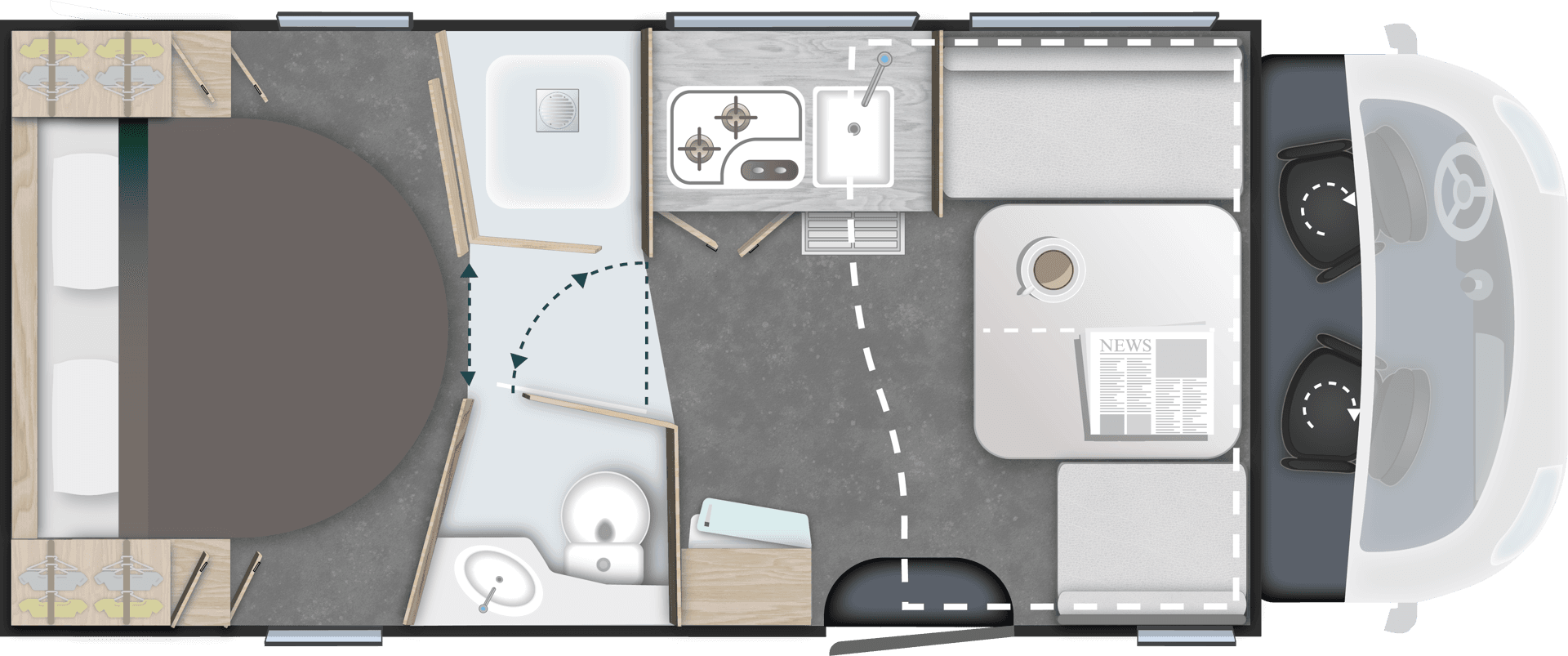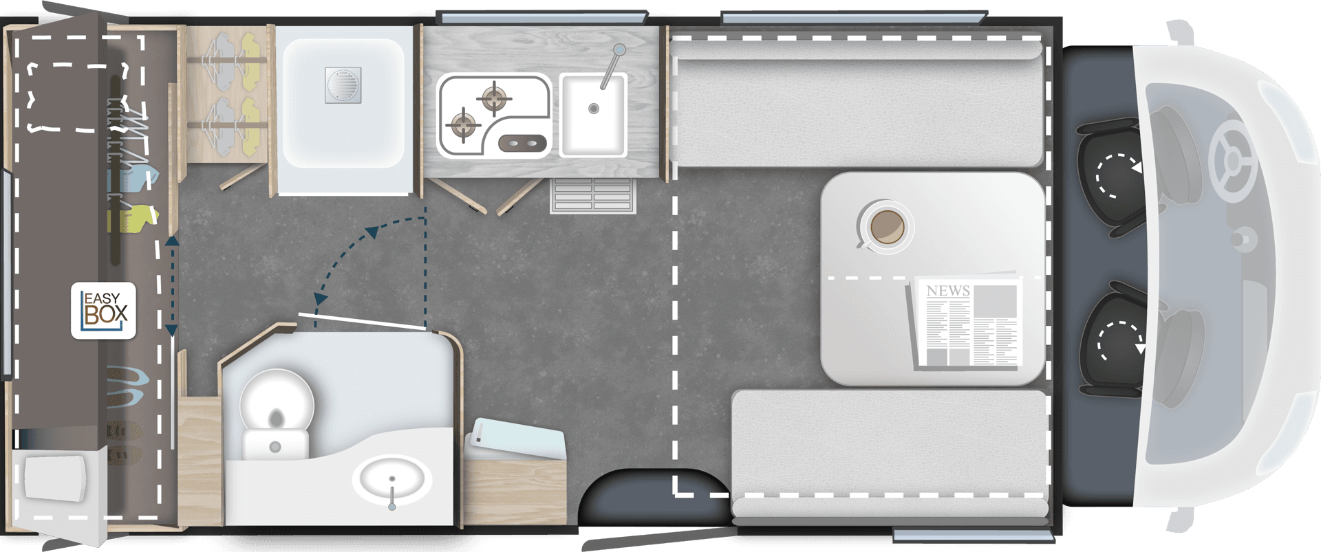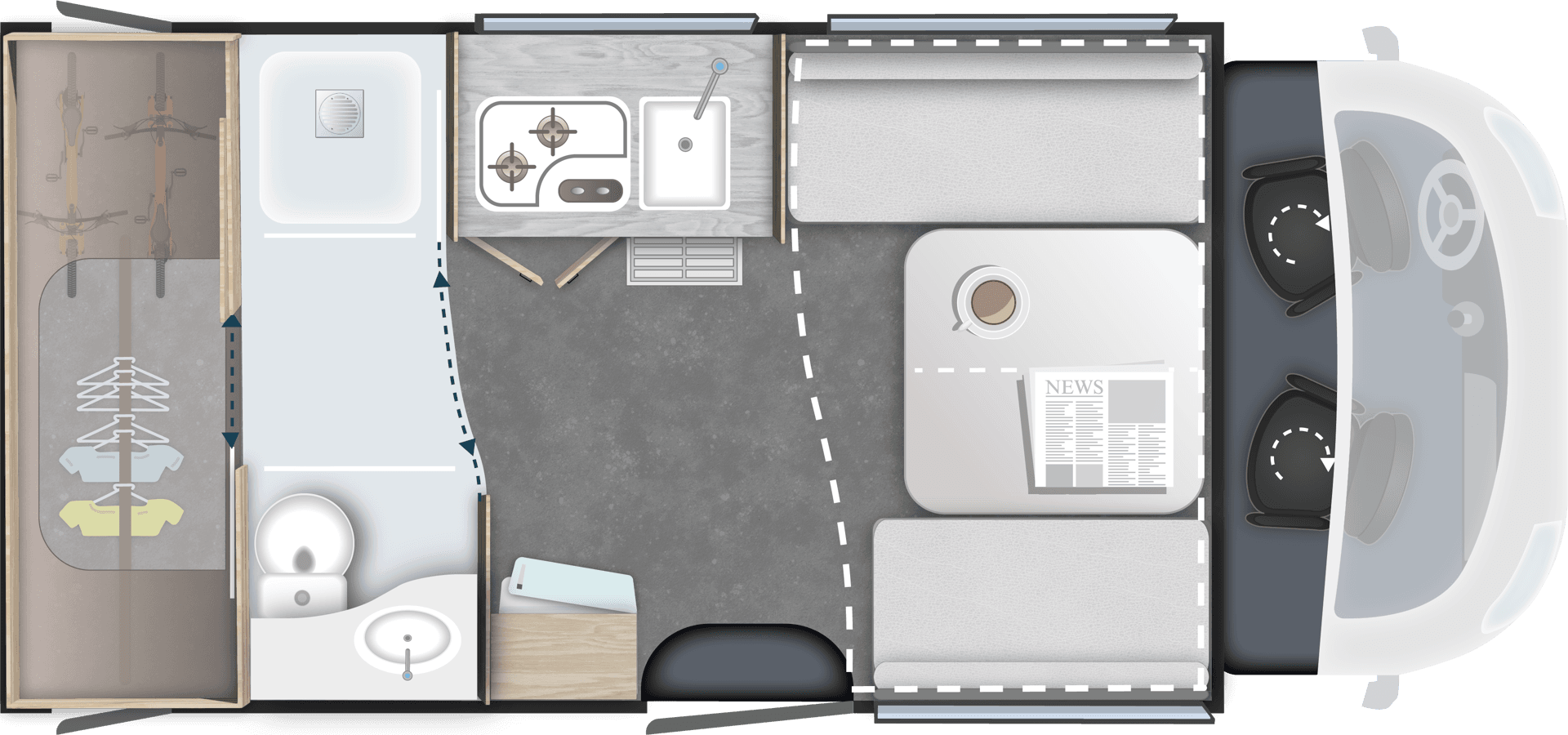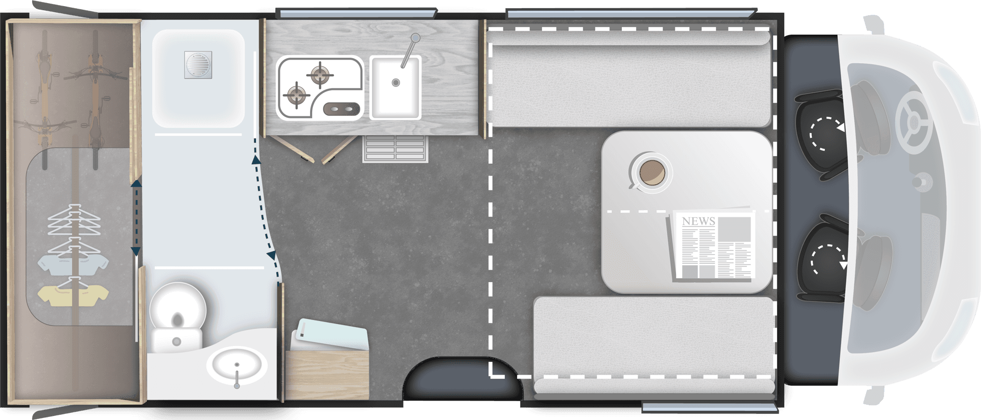 TilbehørspakkeUtvendig markise, 140W solcellepanel, myggnettdør, gardiner til førerhytte, forlengelse av enkeltsenger* (kan føre til tap av en plass i vognkortet)Verdi kr. 49.900