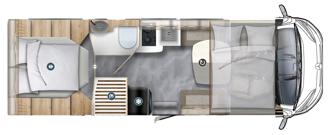 Sprinter-chassiset gir en solid og komfortabel base for bobiler som inkluderer teknologi som MBUX multimediesystem, ergonomiske førerseter og mulighet for oppvarmet dobbeltgulv for helårsbruk.