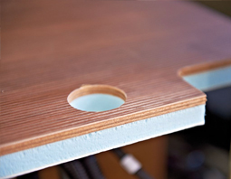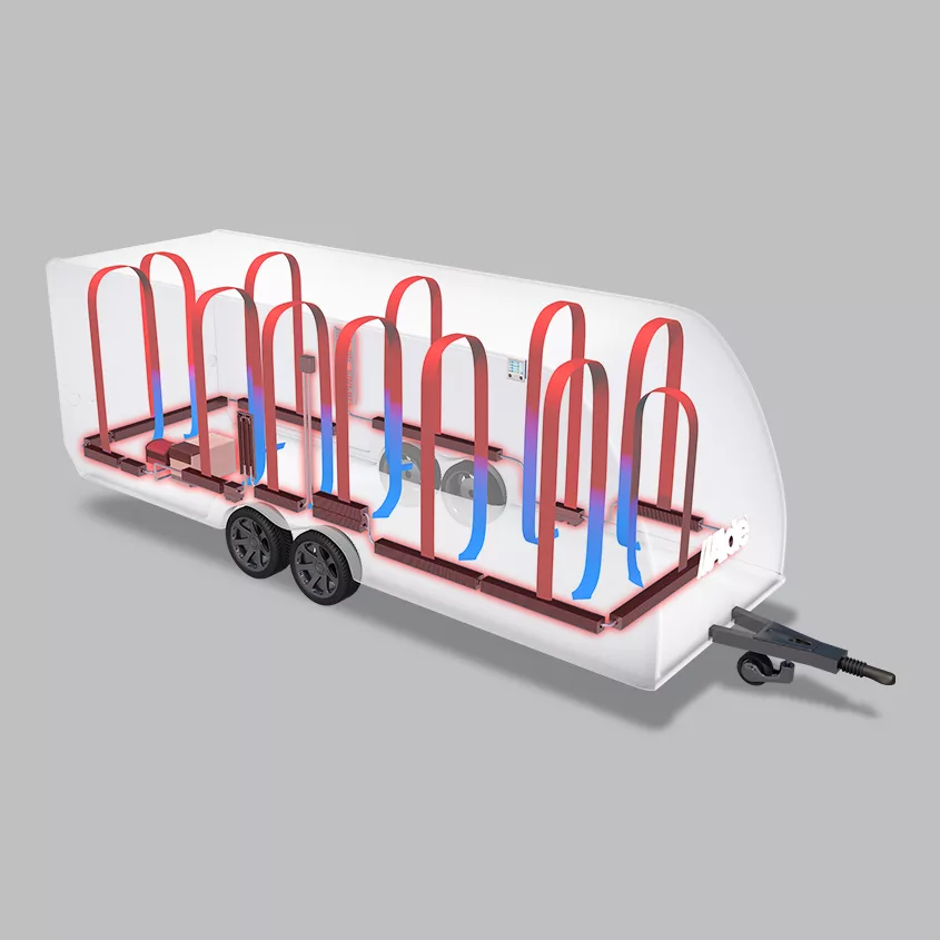 Siden vi ikke trenger å benytte tunge avstivere av tre, reduserer vi vekten mye med GRP-veggene våre. De er så stabile at selv ikke hagl kan skade ytterveggene. Et gjennomgående, lett isolerende lag forbinder ytterveggene med innerveggene, som også er utført i det vektreduserende materialet GRP. I tillegg er «vidundermaterialet», GRP, også fuktavvisende.