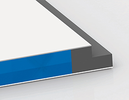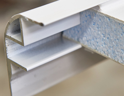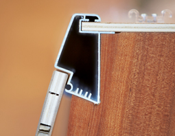 Forbindelsen mellom veggene og taket kan også utføres uten skruer. Til dette blir en lett, pulverlakkert alu-profil limt over hele flaten. Slik kan vi unngå en ekstra dekningsprofil i overgangen – dette gjør i tillegg konstruksjonen enda lettere.